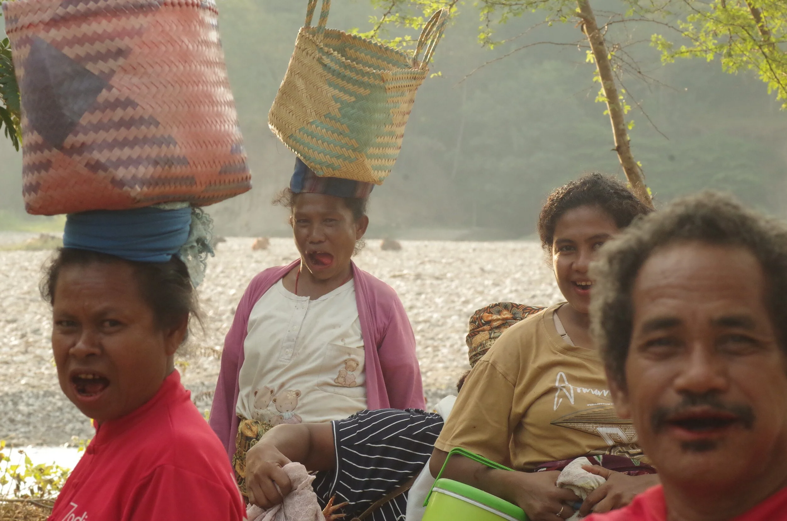 People of Billa village gathered in a feast held after a ritual sacrifice to propitiate Uis Neno (their animist god) for the new water canal to work troughout the year. Billa Village, Amanuban Timur, Nusa Tenggara Timur, Indonesia, Monday (July 22nd, 2019). The ritual, lead by a shaman (called dukun) involved the spilling of fresh blood of chickens into the new canal. Afterward, they roasted the sacrificed chickens in an open field nearby and ate together with rice and sambal. Fresh blood was part of the ritual sacrifice of their animism belief that is still held until today despite the presence of Christianity.